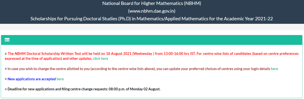 - Aspiring for selection in the next round of recruitment for the Integrated PhD programme in Mathematics of an institution that receives from NBHM the test scores for screening for admission to that programme (such as the seven mentioned above).