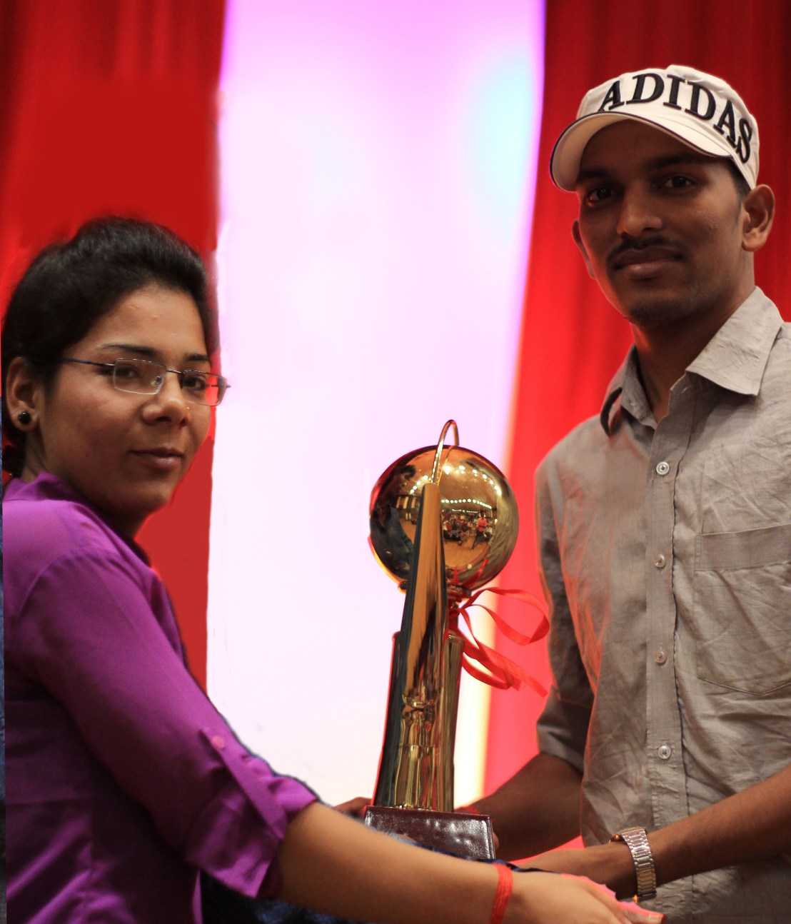 (From L-to-R : Munesh, Muktikant, Kalika and Deependra) hold the trophy which was given to our School(School of Mathematics, Statistics and Computer Science) as a winner of this event.