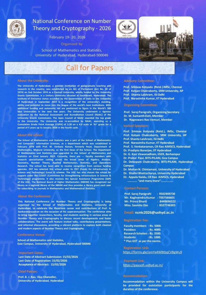 This two-day hybrid event is designed to bridge theoretical developments with computational practice in algebraic coding theory. 𝐏𝐫𝐨𝐠𝐫𝐚𝐦 𝐇𝐢𝐠𝐡𝐥𝐢𝐠𝐡𝐭𝐬: Expert Lectures: Learn directly from globally renowned experts. Specialized Training: Hands-on sessions on MAGMA for algebraic computation and code construction. Key Topics: Linear & LDPC codes, Code-based functions, and Quantum codes.